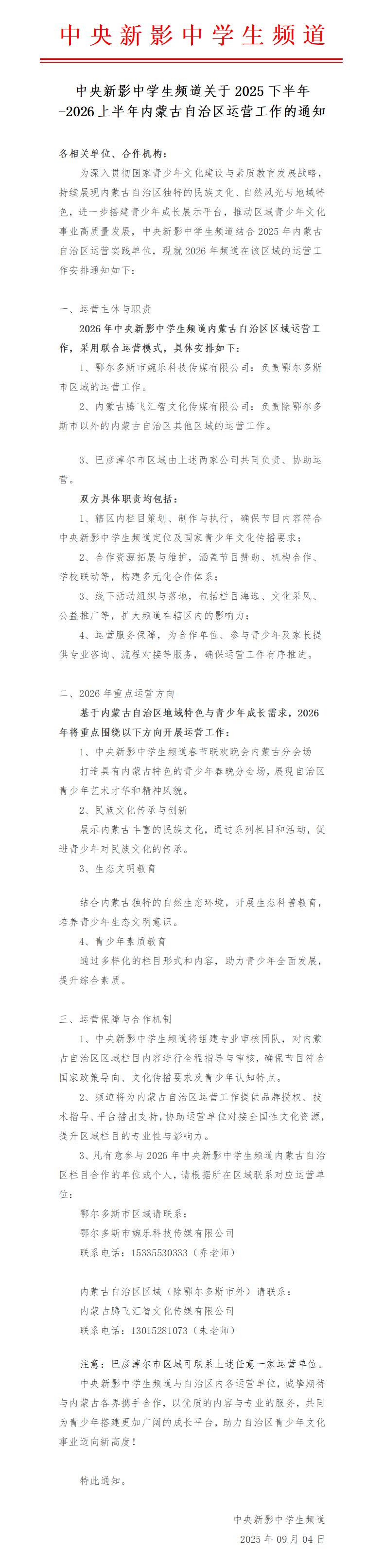 中央新影中学生频道关于2025下半年—2026上半年内蒙古自治区运营工作的通知