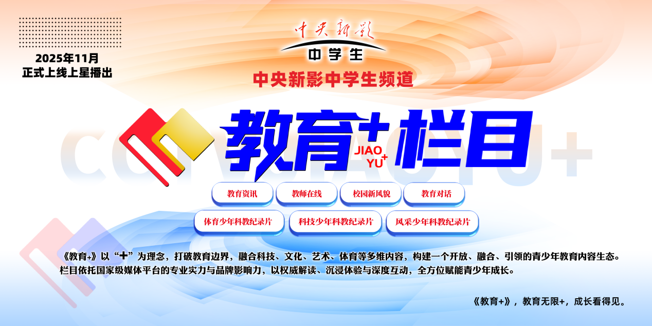 为深入贯彻落实国家关于建设教育强国的战略部署,积极适应新时代青少年成长与教育发展需求,中央新影中学生频道秉持国家级青少年媒体的使命担当,决定成立《教育+》栏目。