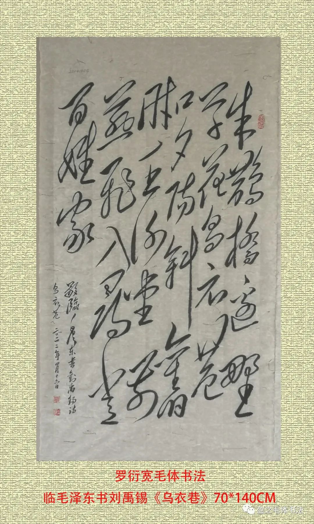 纵观罗衍宽先生的毛体书法,其笔锋多变、疏密有致、洒脱峻利,狂放中注意收敛,苍茫中不失雅韵,突出体现了毛泽东书法艺术的辩证法特点。特别是《为人民服务》和《毛主席对开国元帅的独特评价》、《毛主席妙语点评开国十大将》、《续毛泽东书白居易<长恨歌>》等作品,集中展现了罗衍宽先生多年来学习研究和创作毛体书法的成果,开拓了弘扬毛泽东思想与传承发展毛体书法文化相融合的新路径,将为推动中国文化繁荣,增强文化自信,发挥良好助力作用。