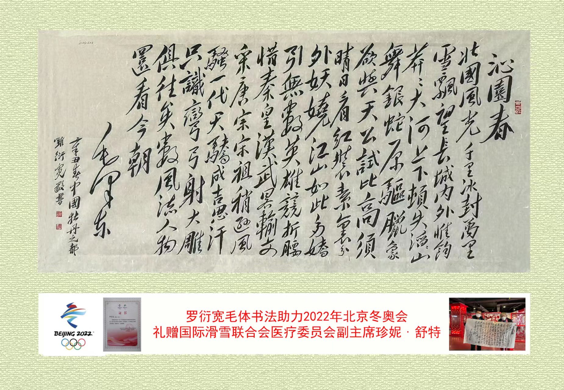 罗衍宽,字盈之,1962年出生于中国工笔画之乡——巨野,上校军衔,高级编辑。自幼受父亲绘画艺术的熏陶,酷爱书画艺术,尤其对毛主席书法艺术偏爱有加。罗衍宽先生秉持敬仰之心和炽热之爱,在学习、从军和工作生涯中,四十多年,刻苦习练毛体书法,持之以恒、笔耕不辍,所获甚丰。2018年,为中央党校荣幸泼墨《“四个建成”奋斗目标》,被中央党校收藏;2019年为庆祝新中国七十华诞,以毛泽东49首诗词为内容,激情挥毫创作的70米毛体书法长卷,被国内多省市电视台、网络媒体和报刊刊播,广得赞评,并备受原济南军区政委宋清渭上将推崇;同年,受邀为《山东双拥报》题写的报头,采用发行后受到军民一致好评;2022年,在北京冬奥会上,罗衍宽先生毛体书作被作为“国礼”,赠予国际滑雪联合会医疗委员会副主席珍妮•舒特等国际友人。